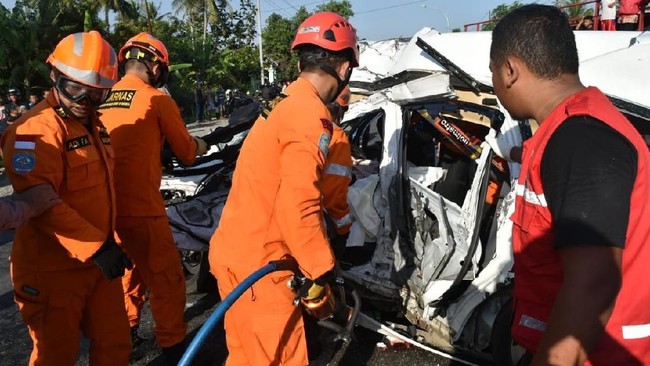 "Setelah oleng, minibus tersebut di tabrak bus dari arah barat. Korban meninggal dunia tiga orang dan luka-luka satu orang," bunyi keterangan dari Basarnas.